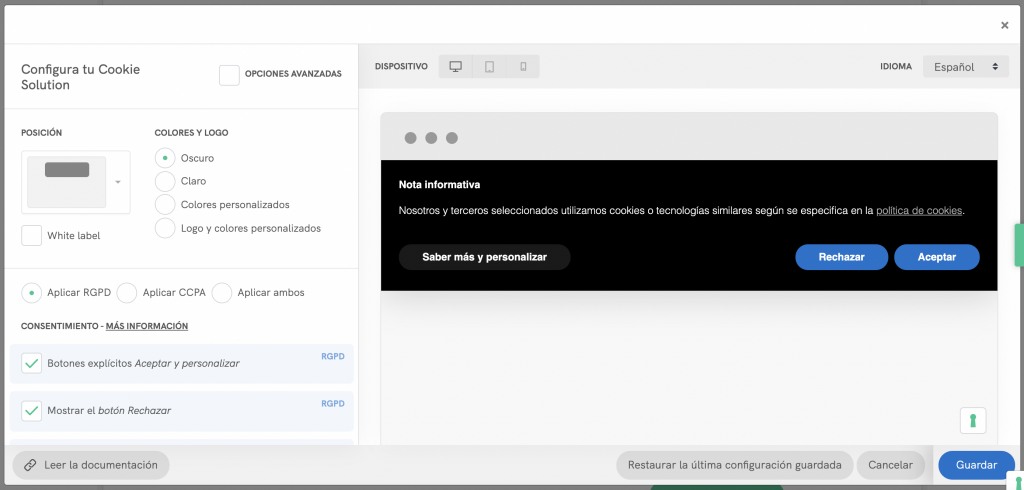 Genera un banner de cookies profesional y gestiona el consentimiento de cookies con facilidad