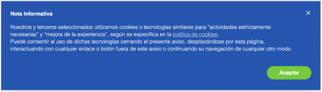 - mostrar un aviso o banner de cookies en la primera visita del usuario que sea claramente visible (puedes consultar los contenidos que debería tener el banner aquí);