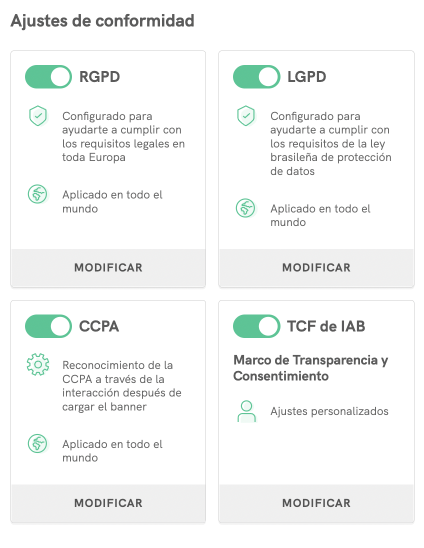 👉 No marques previamente las opciones en tu banner de cookies. Asegúrate de seleccionar todos los ajustes de conformidad para configurar automáticamente un banner de cookies.