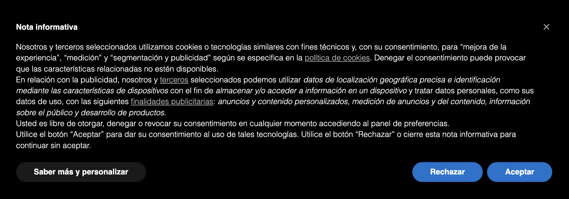 En lugar de proporcionar una simple opción de sí o no, las empresas utilizan todos los trucos posibles para manipular a los usuarios. Hemos identificado más de quince abusos comunes. El problema más habitual es que simplemente no hay un botón de “rechazar” en la página inicial.