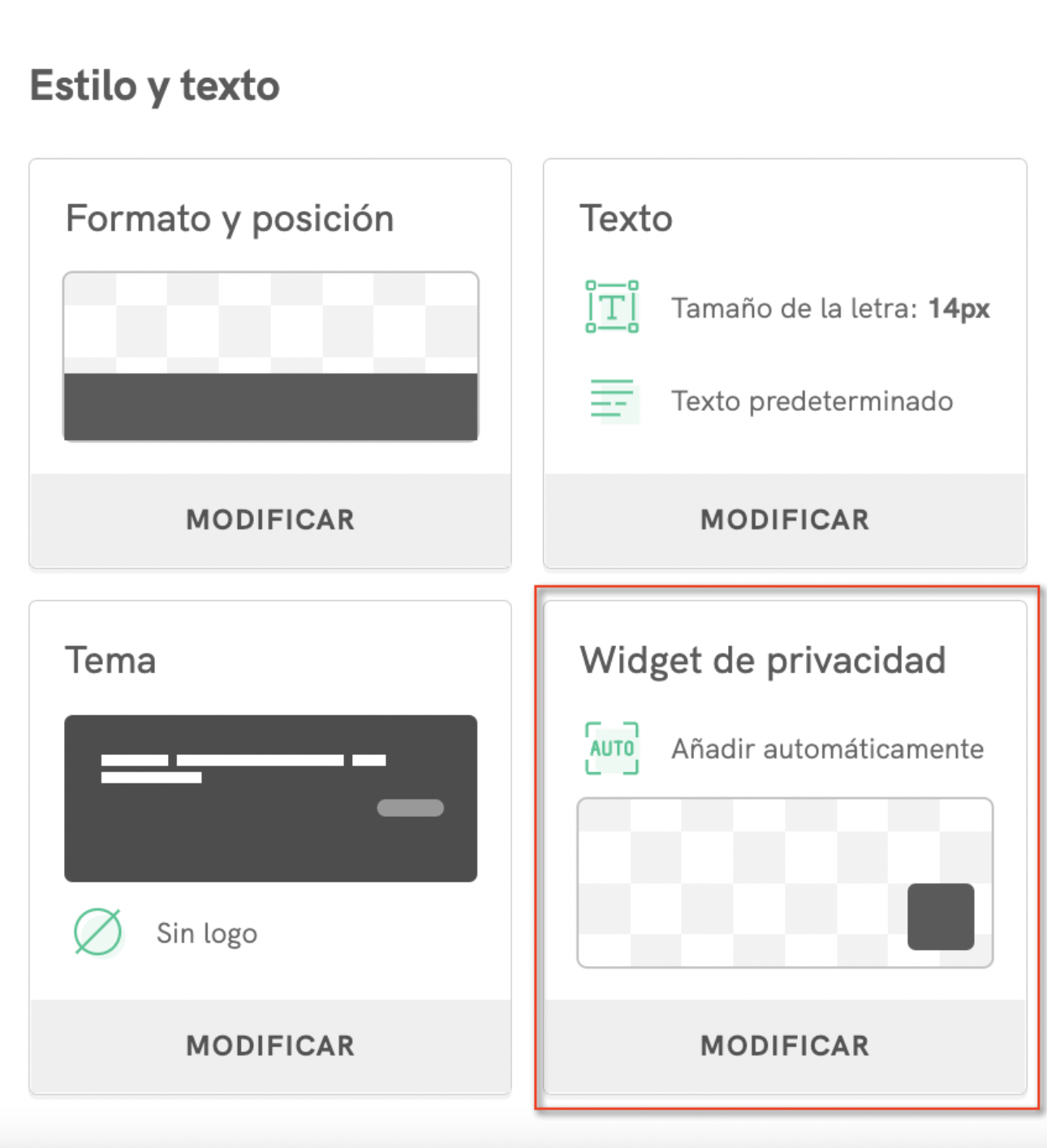 Dentro de las opciones del Widget de privacidad (en Estilo y texto) puedes personalizar la posición, el formato y los colores de tu widget o elegir añadir un enlace en el pie de página para acceder a las preferencias de privacidad y seguimiento.