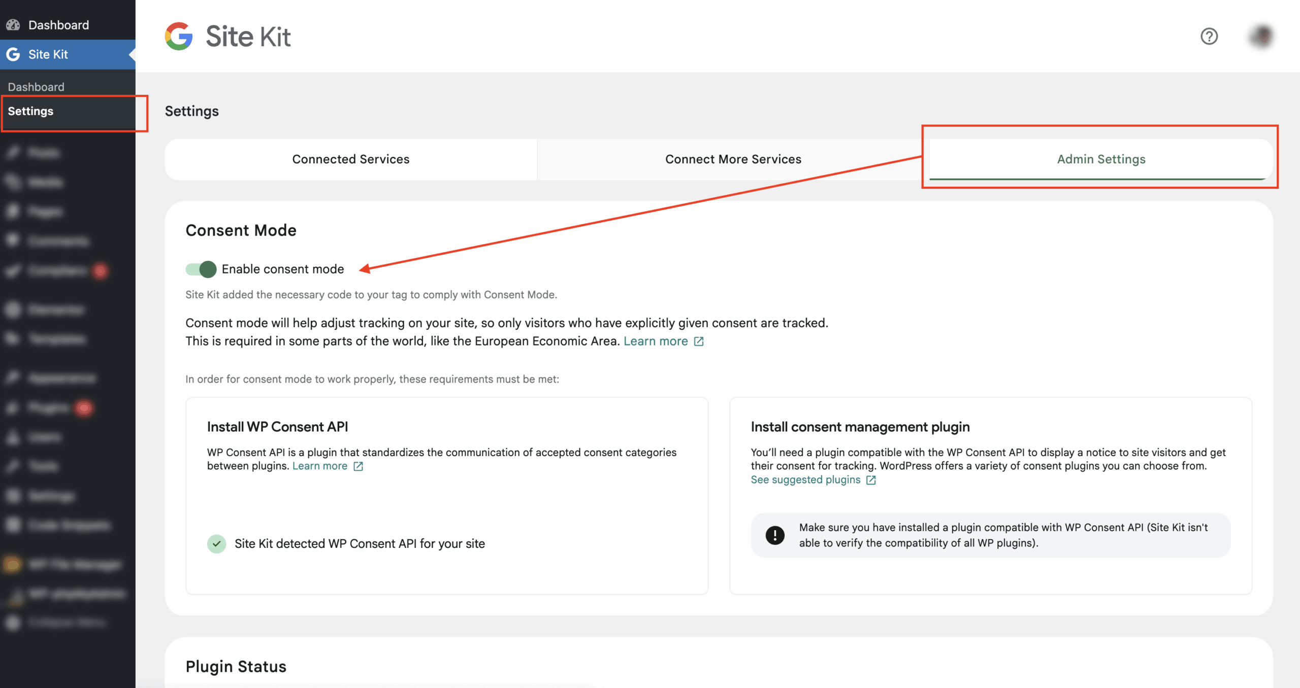 Si mantienes activado el Modo de Consentimiento en Site Kit, debes instalar el plugin WP Consent API.
