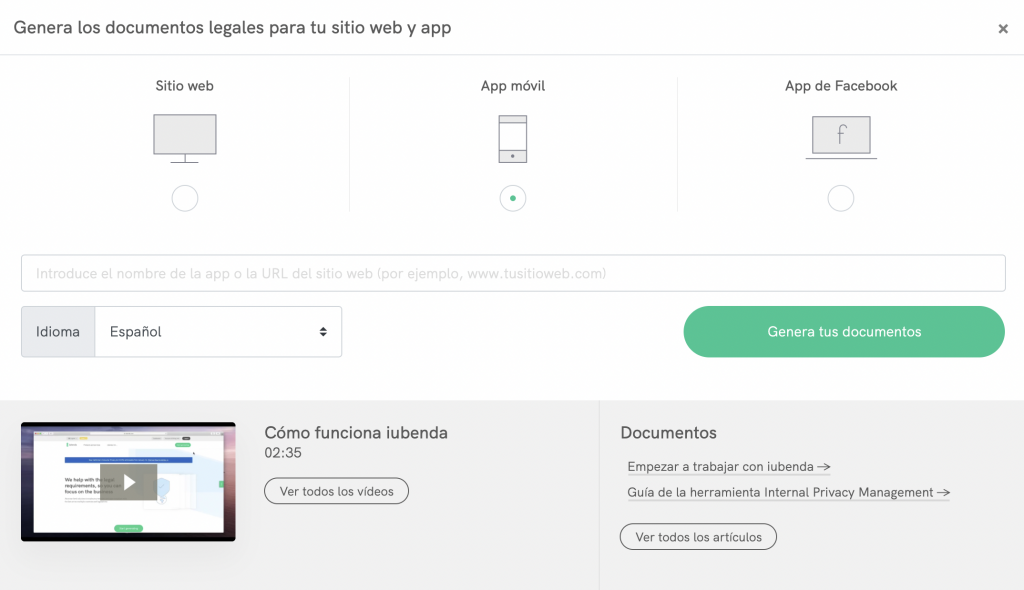 Genera tu propia política de privacidad para tu app móvil haciendo clic en Genera tus documentos > App móvil: