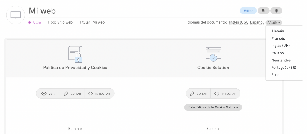 Cualquier cambio que realices en un idioma de tu política de privacidad/cookies se añadirá automáticamente al resto de idiomas (con la excepción de los servicios personalizados, como ya mencionamos anteriormente).