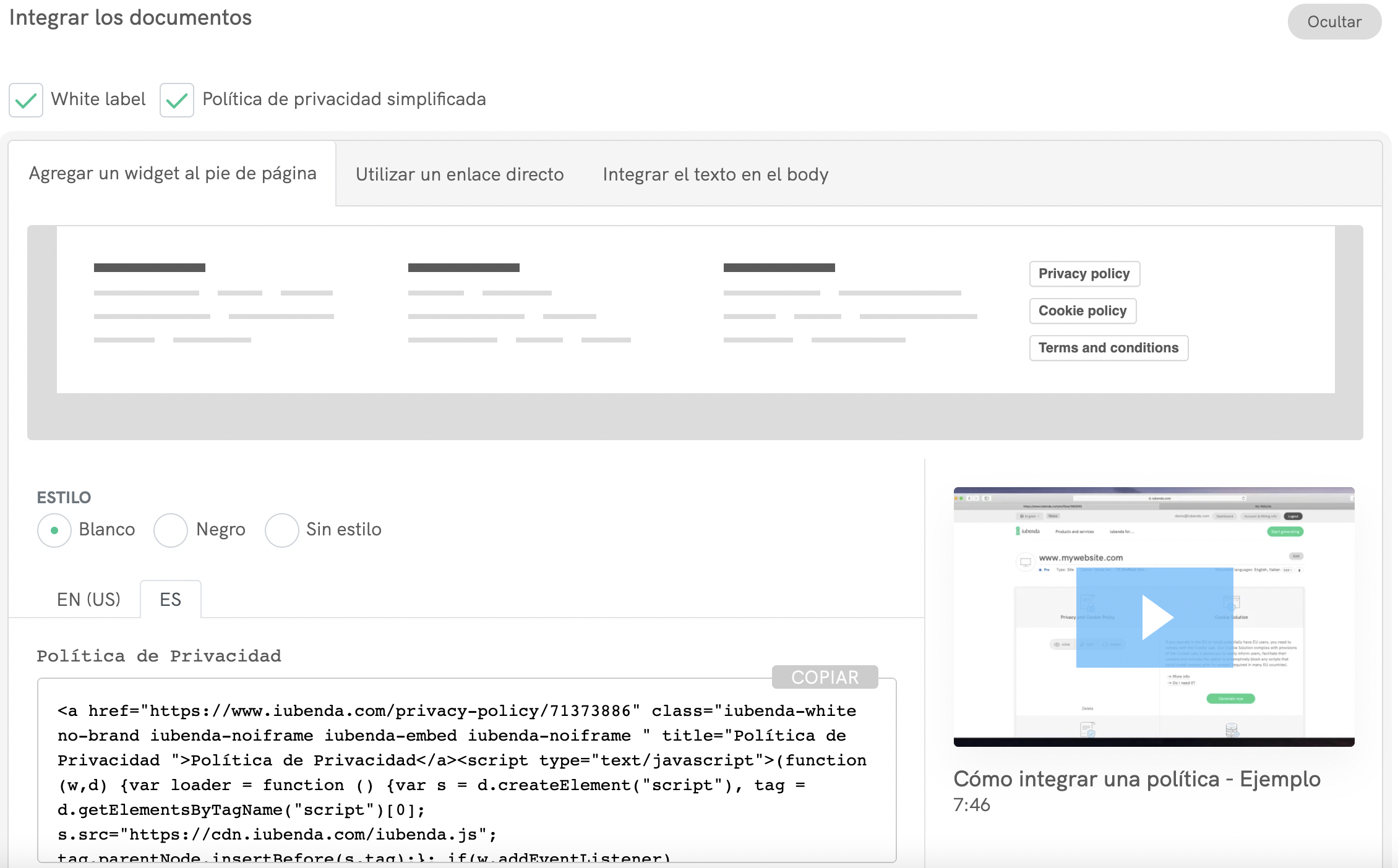 La política de privacidad de iubenda ofrece tres opciones de integración que se pueden utilizar para diferentes propósitos: