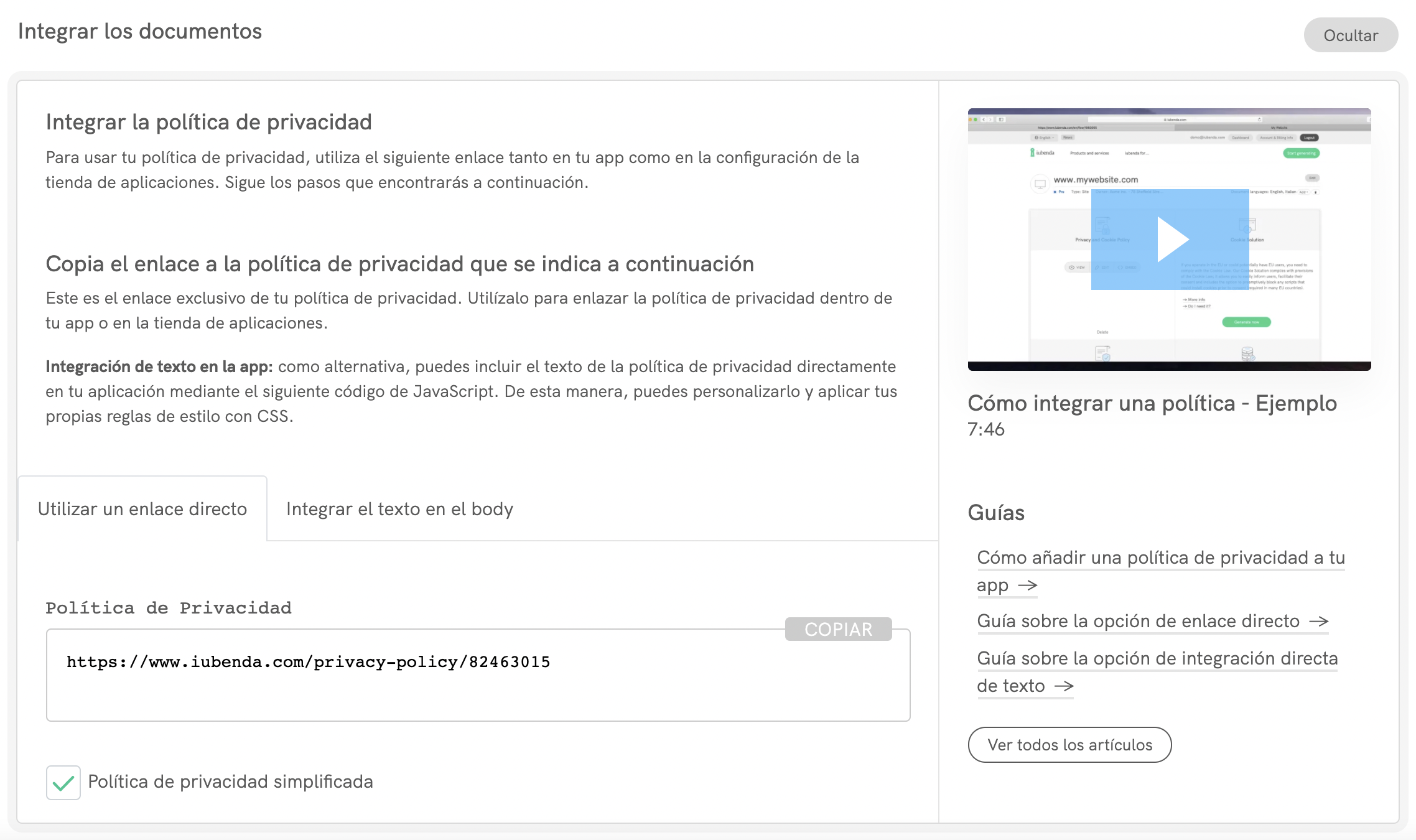 Más información sobre la opción Añadir iubenda a tu web (opción de integración de texto directa).
