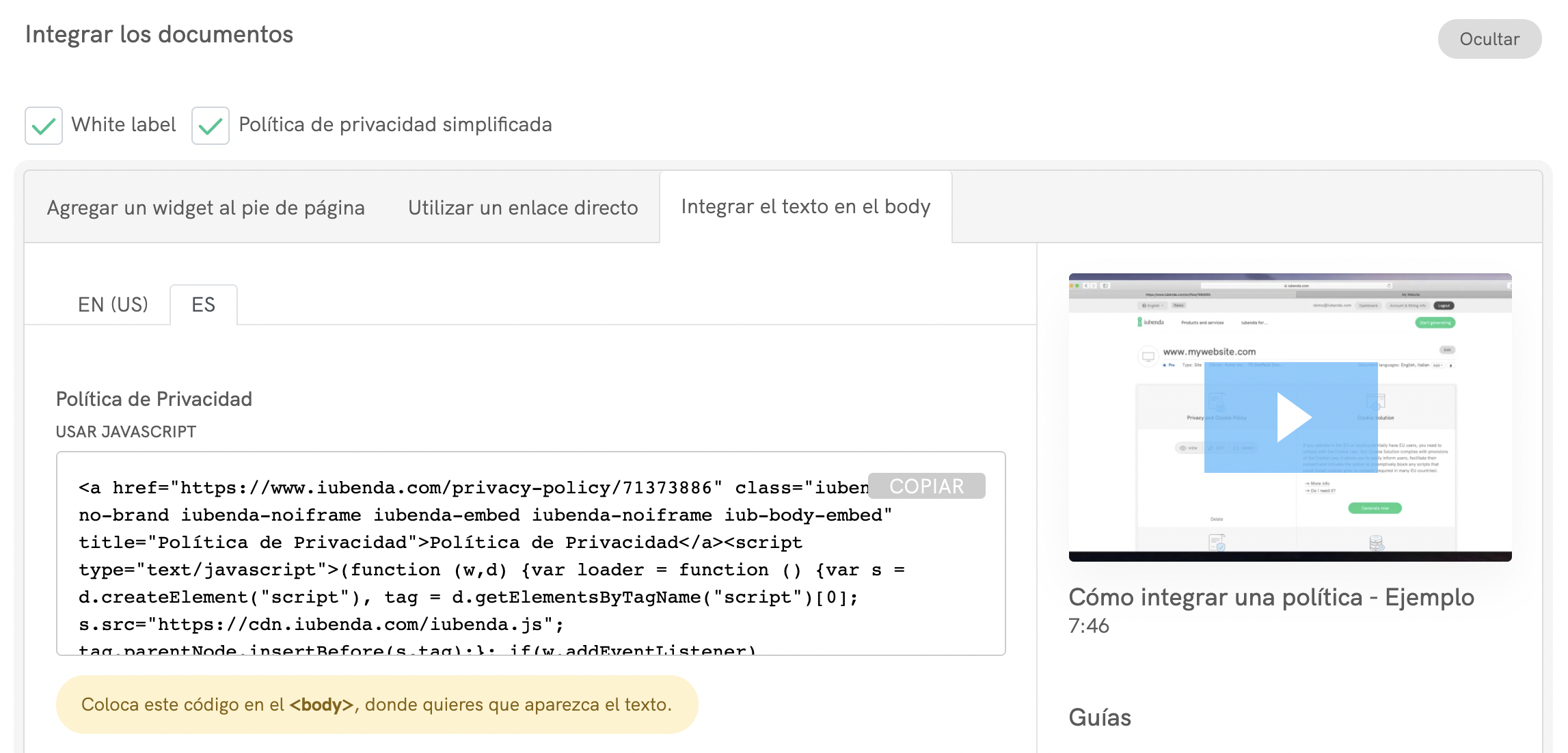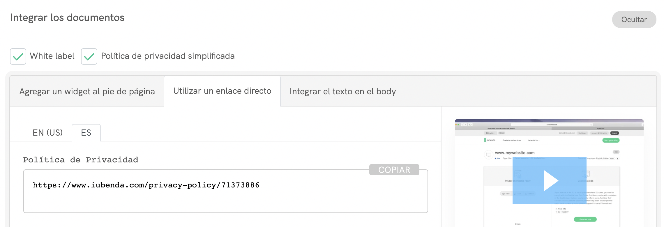 Entra en tu dashboard de iubenda, haz clic en [Tu sitio web] > Política de Privacidad y Cookies > Integrar y copia la URL de tu política de privacidad que encontrarás en la pestaña Utilizar un enlace directo.