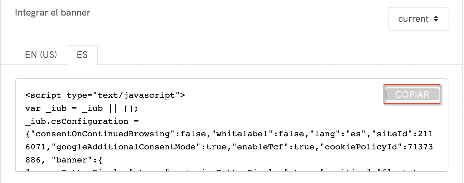 A continuación, debajo de “Integrar el banner”, haz clic en el botón COPIAR en la parte derecha del código.
