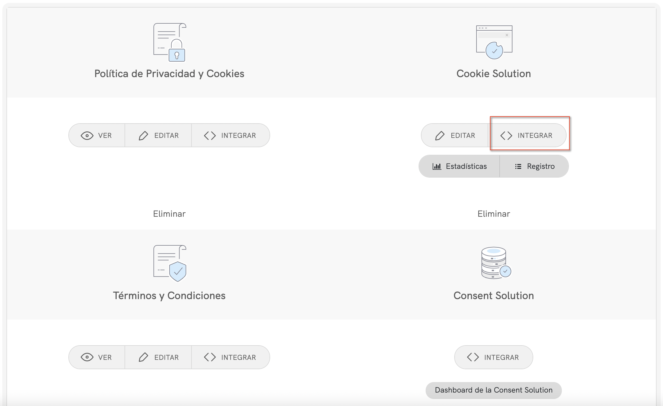 Vamos a empezar copiando el código que encontramos en la sección de integración de Privacy Controls and Cookie Solution de tu cuenta de iubenda. Debajo del título “Privacy Controls and Cookie Solution” en tu dashboard haz clic en <> INTEGRAR .