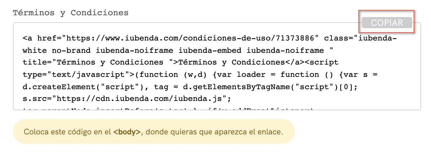 ⚠️ NOTA: al seguir las siguientes instrucciones, debes copiar tu código de iubenda. No copies ni utilices el código de muestra que se muestra en esta guía.