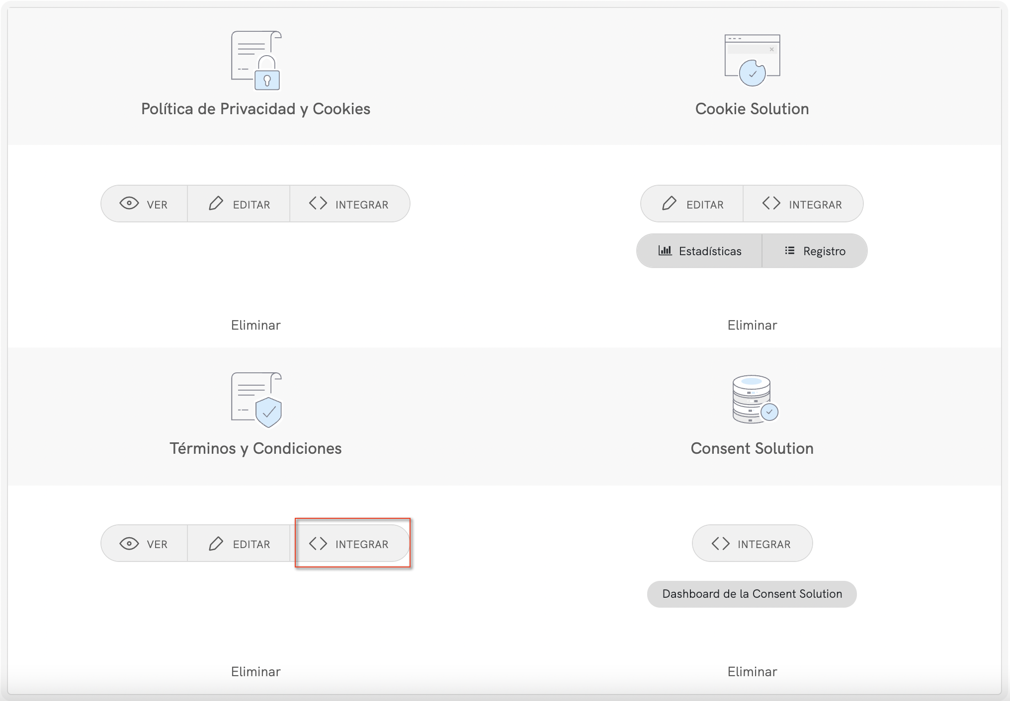 Para empezar, primero dirígete a tu dashboard de iubenda, haz clic en [Tu sitio web] > Términos y Condiciones > Integrar.