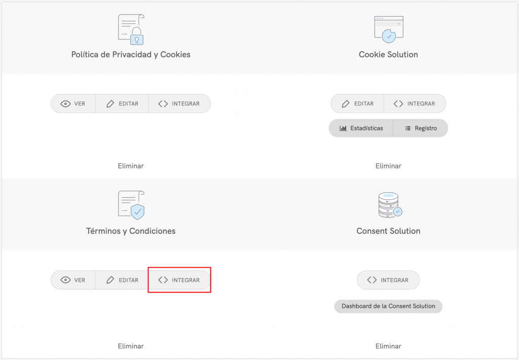 Para empezar, primero dirígete a tu dashboard de iubenda, haz clic en [Tu sitio web] > Términos y Condiciones > Integrar.