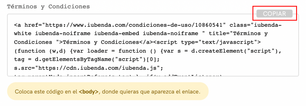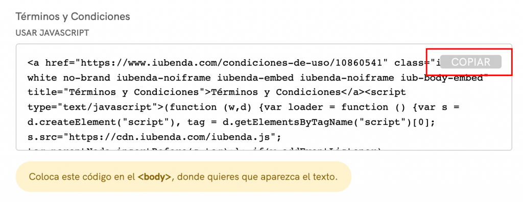 Selecciona Integrar el texto en el body, desplázate hacia abajo hasta Términos y Condiciones y haz clic en COPIAR.