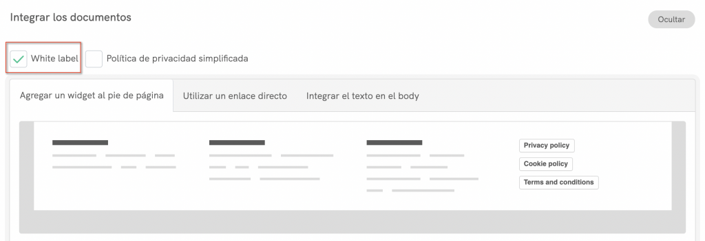 Al copiar el código directamente se seguirá aplicando el estilo de iubenda (tipo de letra, etc.) a tu documento. Si deseas que el documento tome el estilo directamente de tu sitio web, selecciona la opción white label aquí.