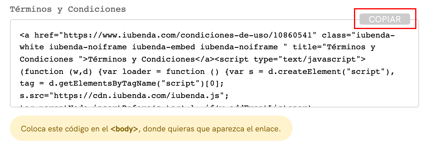 Selecciona Integrar el texto en el body, desplázate hacia abajo hasta Términos y Condiciones y haz clic en COPIAR.