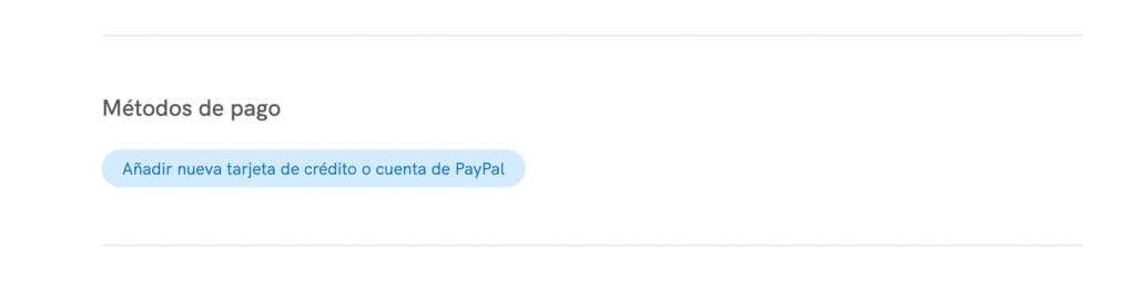 Luego desplázate hacia abajo hasta la sección “Métodos de pago” y haz clic en el botón azul  “Añadir nueva tarjeta de crédito o cuenta de PayPal”