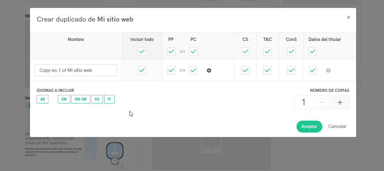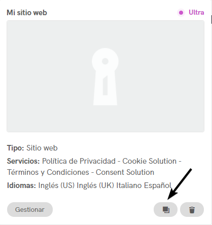 • dirígete a la página de tu sitio web/app (Dashboard > [tu sitio web]) y haz clic en el botón Duplicar (junto al icono de la papelera).
