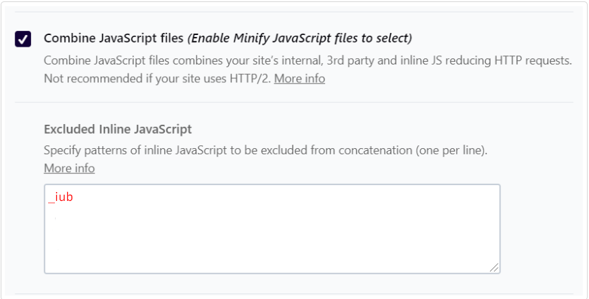 En général, il faut également envisager d’exclure de chaque fonction d’optimisation JS de votre plugin de cache notre fichier externe iubenda_cs.js, stub-v2.js et stub.js.