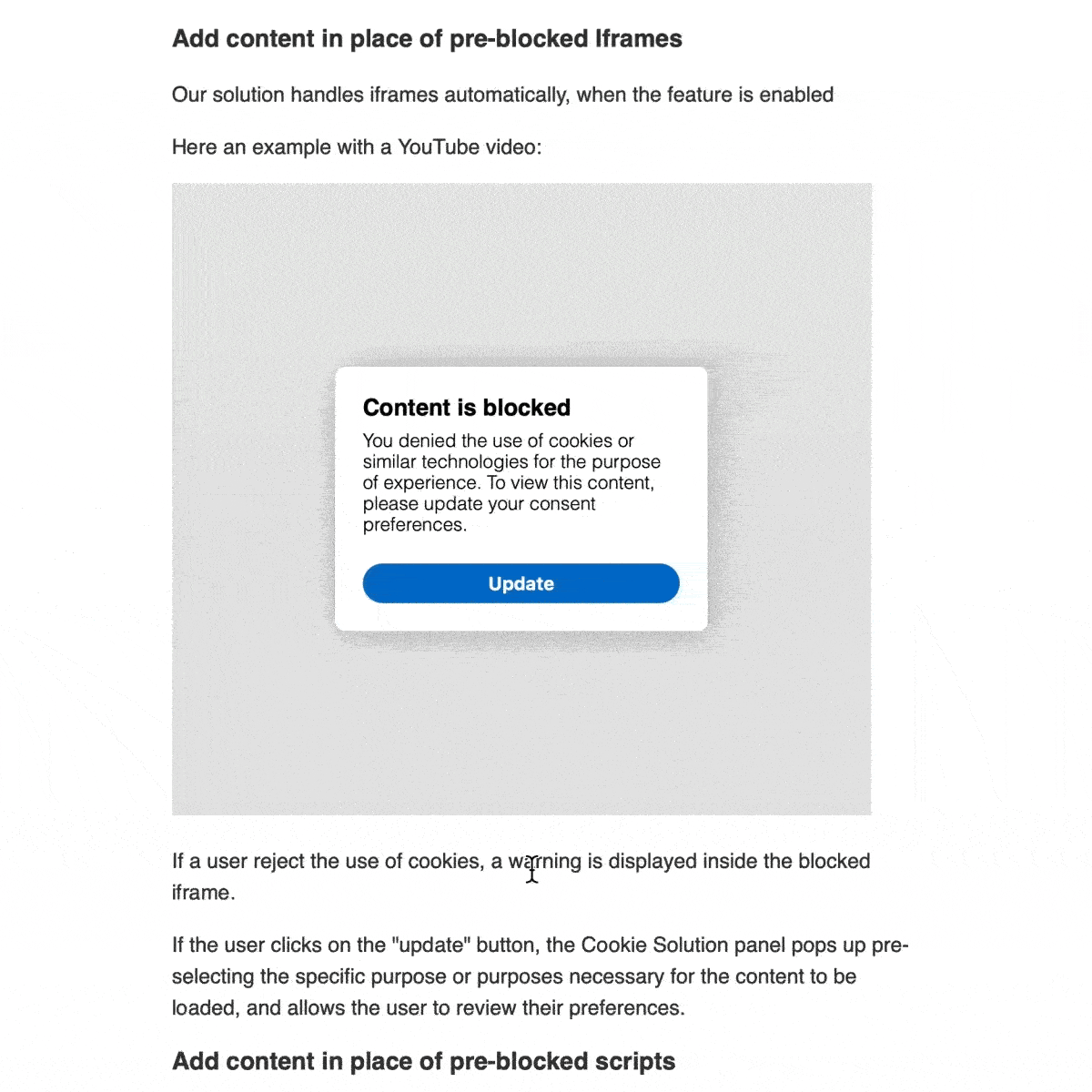 SRécupération de refus : Convertissez les refus initiaux en consentements positifs en affichant un texte personnalisé là où les éléments dépendant des cookies sont bloqués.