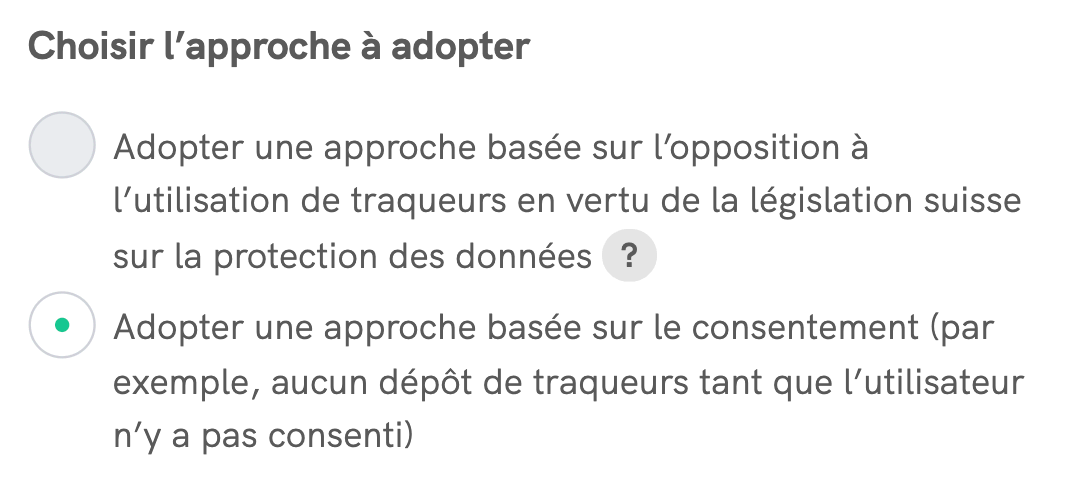 Dans le Générateur, activez la prise en charge au titre du RGPD et de la Suisse. Cela activera automatiquement l’approche « opt-in » dont vous avez besoin pour obtenir le consentement à des publicités personnalisées.
