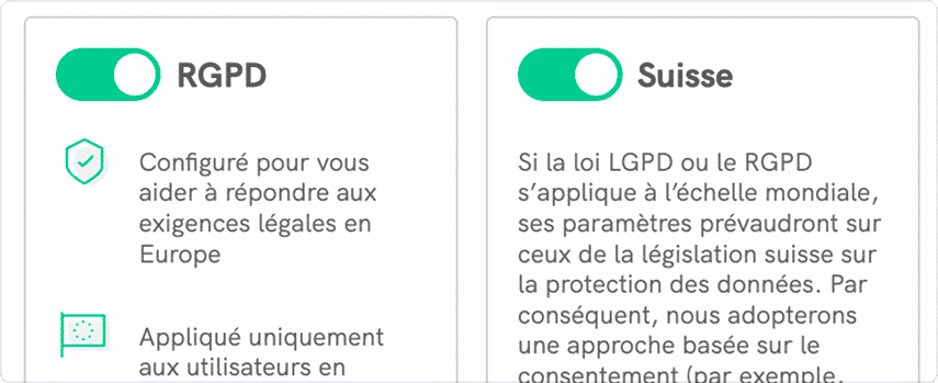Vous avez des utilisateurs aux États-Unis et en Europe ? Notre configurateur intuitif vous permet de vous conformer à plusieurs lois en un seul clic.
