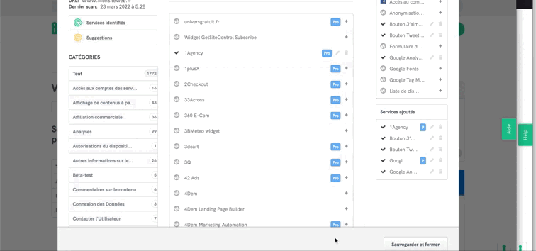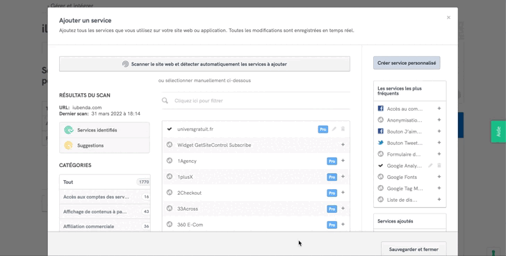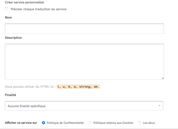 Pour ajouter un service personnalisé : Tableau de bord > [votre site web] > Modifier/ajouter politique de confidentialité > Ajouter service > Créer un service personnalisé