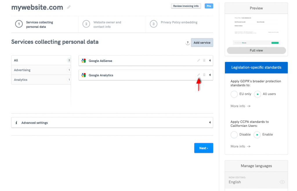 Pour y accĂ©der après avoir dĂ©jĂ ajoutĂ© le service, vous devrez cliquer sur l’icĂ´ne « crayon » permettant de modifier ce service. Vous pourrez ensuite cocher ou dĂ©cocher l’option « vente » CCPA.