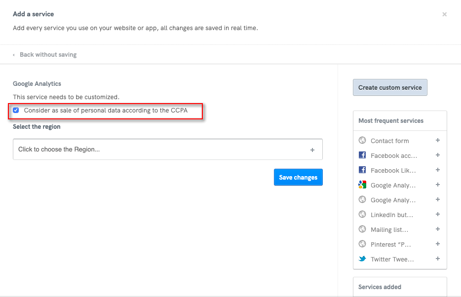 Pour activer cette option, assurez-vous simplement d’avoir bien activĂ© les clauses CCPA en suivant les instructions ci-dessus. La mention sera ensuite activĂ©e par dĂ©faut. Dans la fenĂŞtre de personnalisation d’un service qui pourrait ĂŞtre considĂ©rĂ© comme une vente d’informations personnelles, la case Ă cocher suivante s’affichera. La fenĂŞtre de personnalisation apparaĂ®t après avoir sĂ©lectionnĂ© et ajoutĂ© un service.