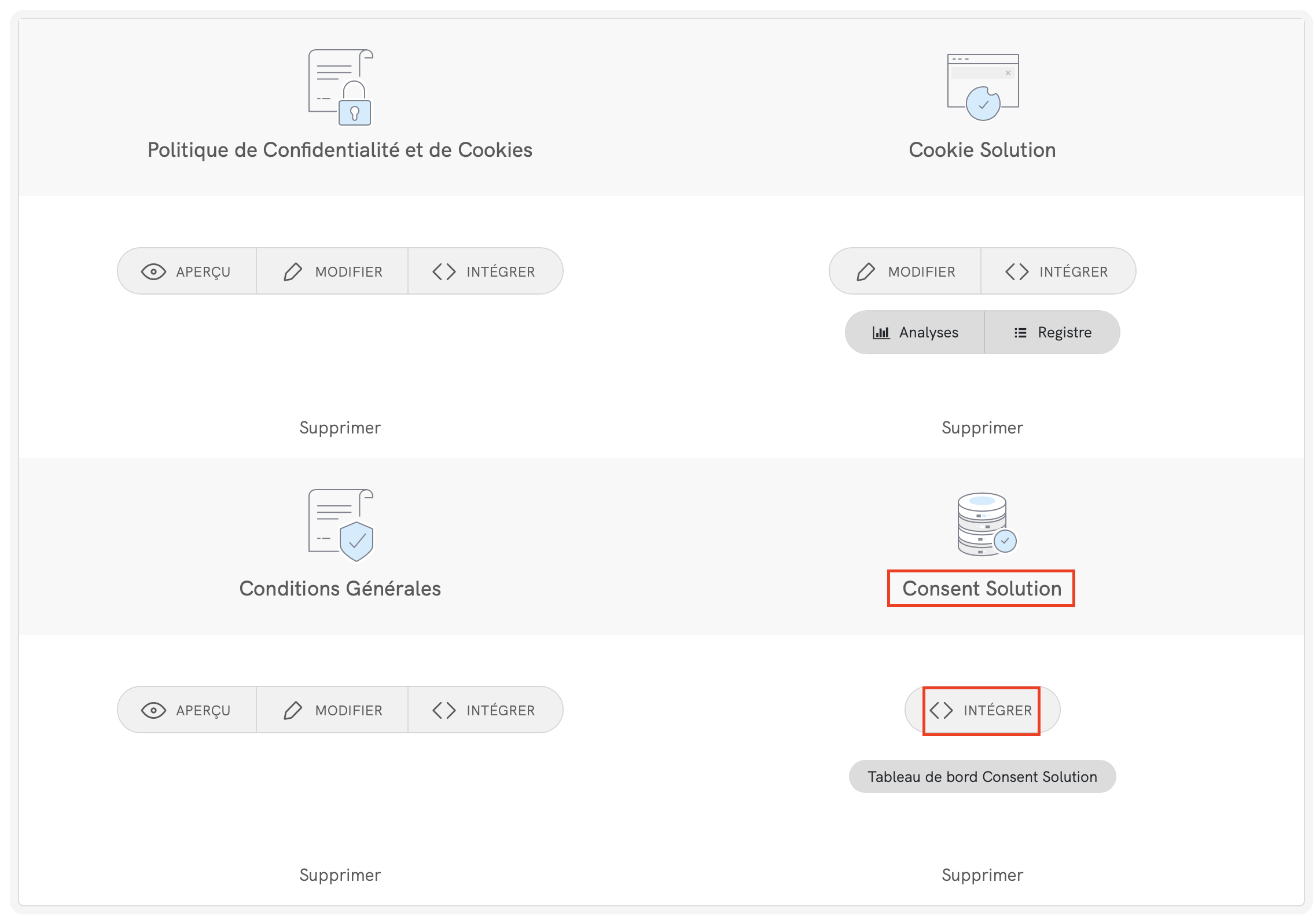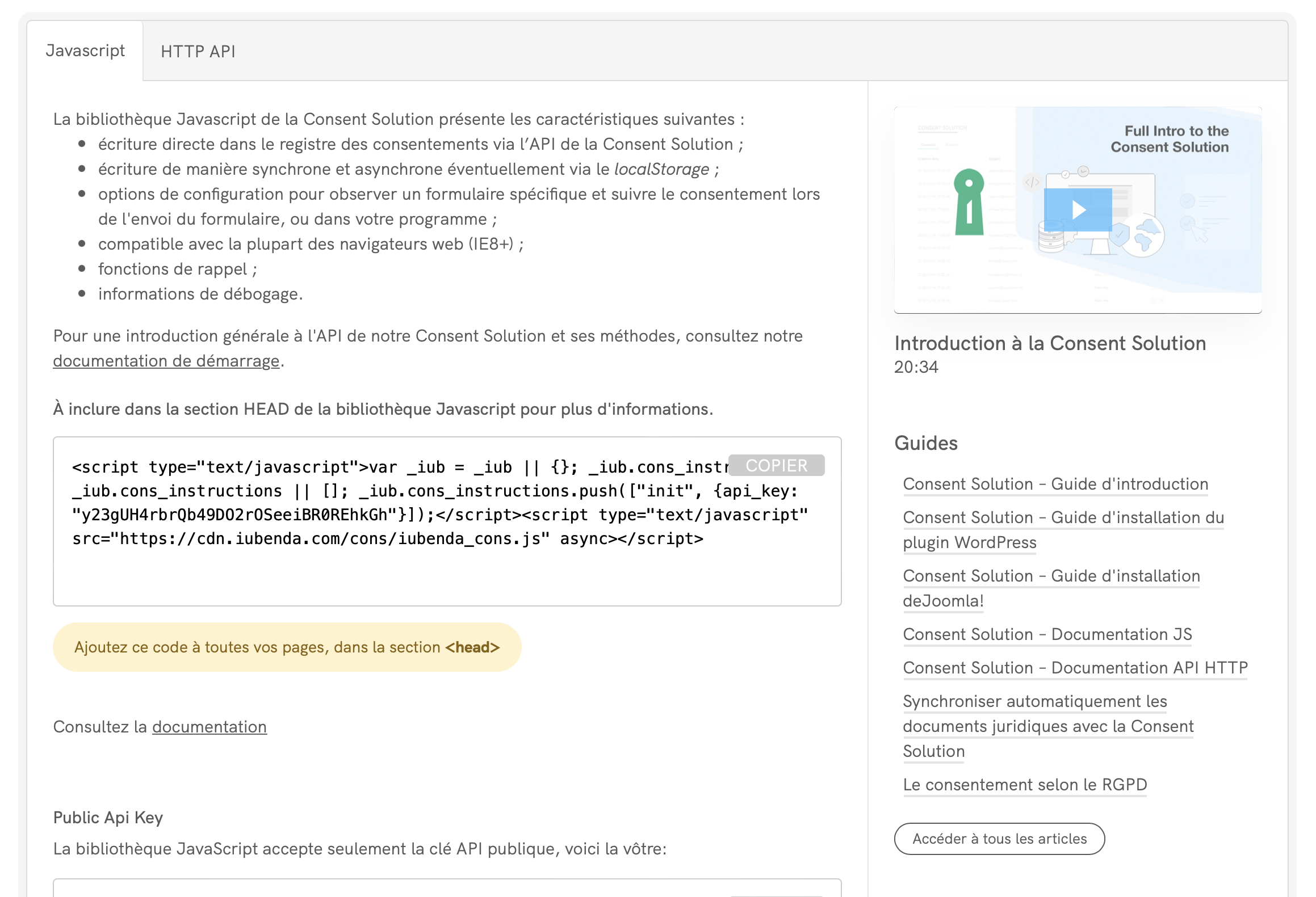 Nous devons copier la Consent Database à partir de votre tableau de bord iubenda. Cliquez sur [Votre site web] >Consent Database >Intégrer