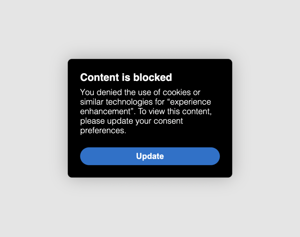 This customizable notice replaces content that cannot be displayed because consent has not yet been granted or because consent has been rejected for that purpose and is therefore blocked by the Privacy Controls and Cookie Solution.