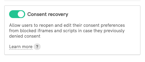 Activating the consent recovery feature is very easy. Just enable the Consent recovery toggle on your Privacy Controls and Cookie Solution configuration: