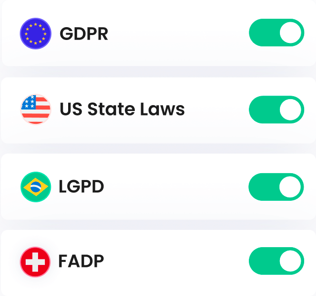 We cover all major global privacy laws, like the EU/UK GDPR, EU ePrivacy (Cookie Law), Brazil’s LGPD, Switzerland’s FADP, and US state laws.
