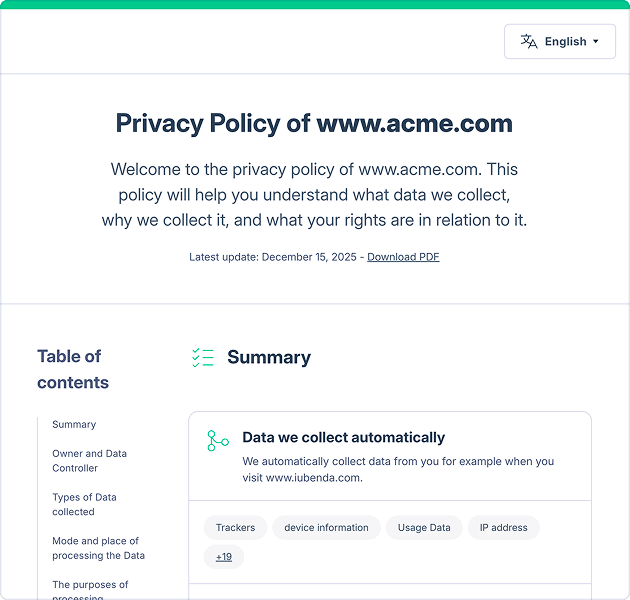 Lawyer-drafted clauses that make sense for your site and services, always updated to reflect the latest regulations. Available in up to 27 languages.
