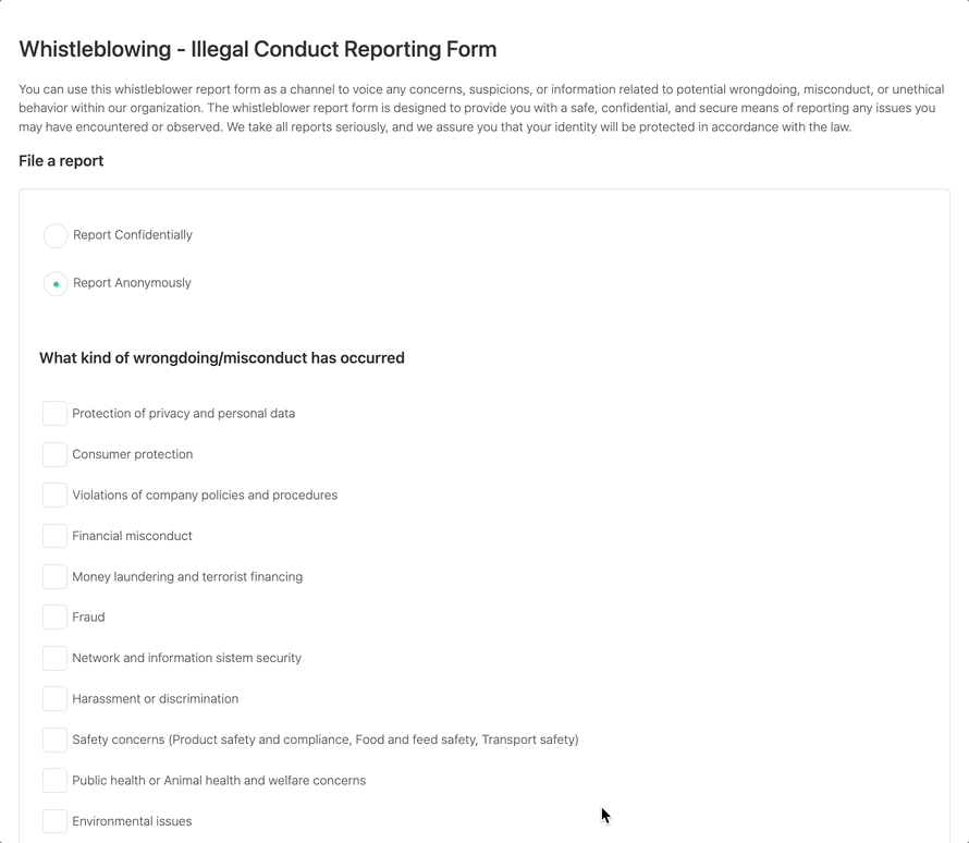 - When a report is submitted, your Whistleblowing Manager receives an email notification instantly, while the anonymous reporting option keeps whistleblowers’ identities a secret.