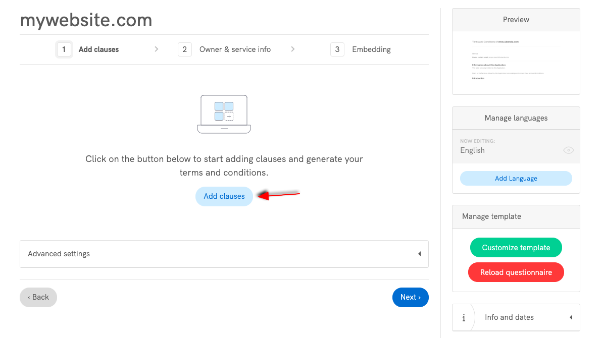 This will open up a window which allows you to select and edit the clauses you’d like to add. If it’s your first time using the Terms and Conditions Generator, you see the following: