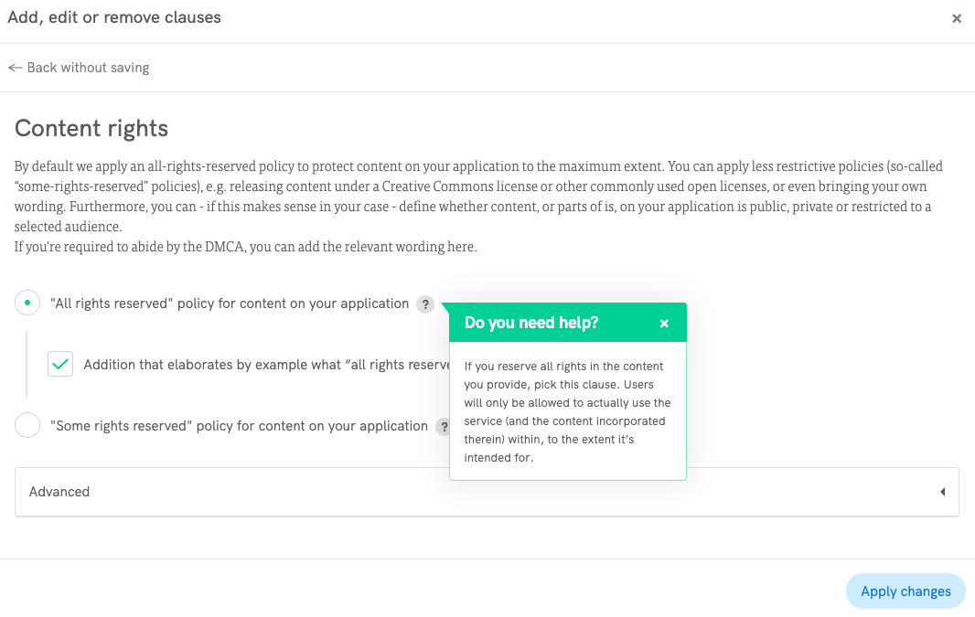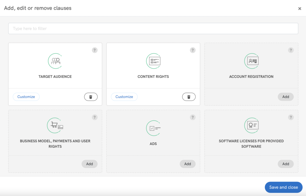 Click on the Apply changes button on the bottom right to save your customizations. This action will take you back to the main “clauses modal” window. If you’re finished customizing your terms, you can click on Save and close on the bottom right of this window and move on to the next step below.