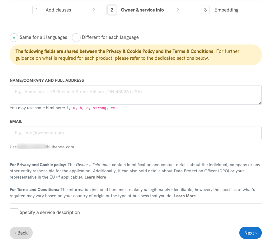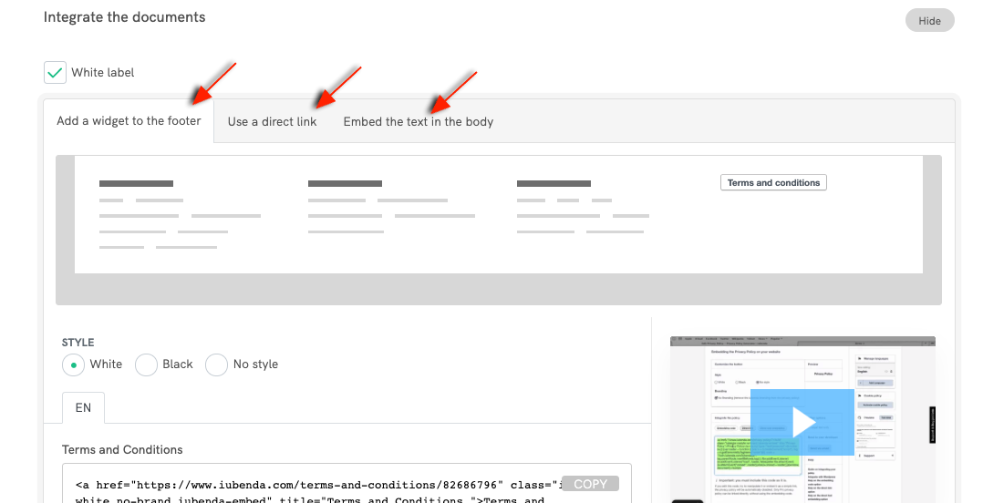 The final step is to integrate the terms you’ve just generated with your website/ app. This is done by using the embedding code, or link provided on the “embed” page.