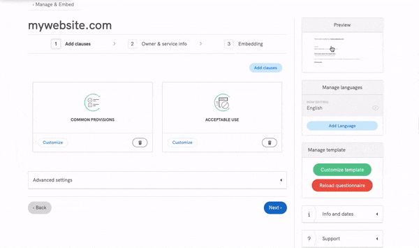 The final step is to integrate the terms you’ve just generated with your website/ app. This is done by using the embedding code, or link provided on the “embed” page.
