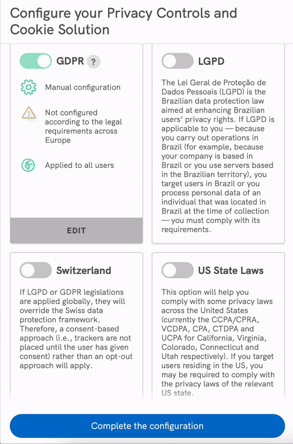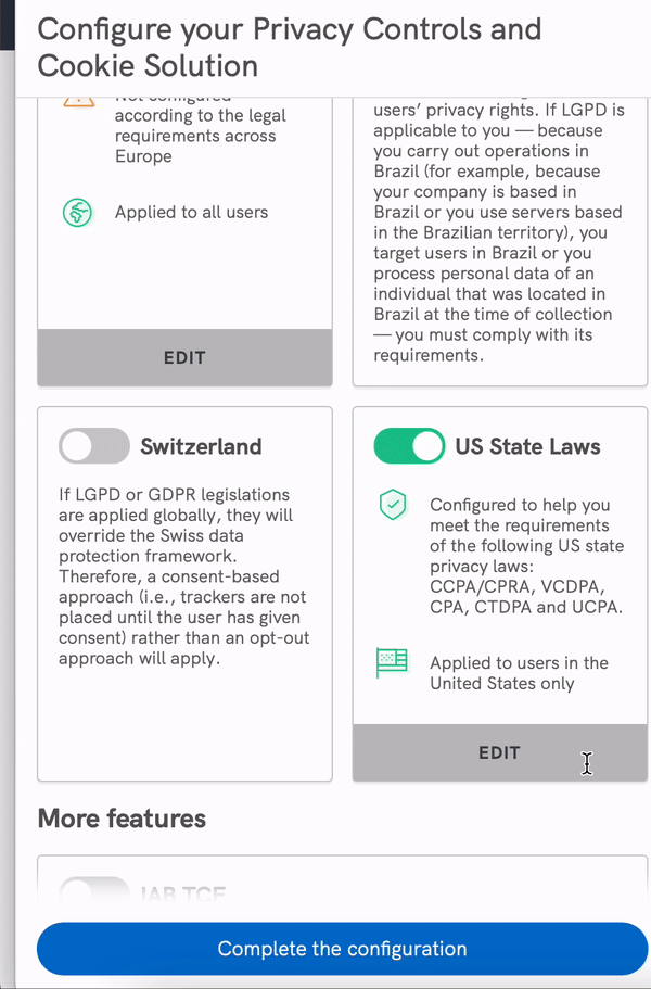 With our Privacy and Cookie Policy Generator, you can now enable, with a single US toggle, a compliance solution for all US state privacy laws that we currently support and ALL upcoming US state legislations that we will support in the future.