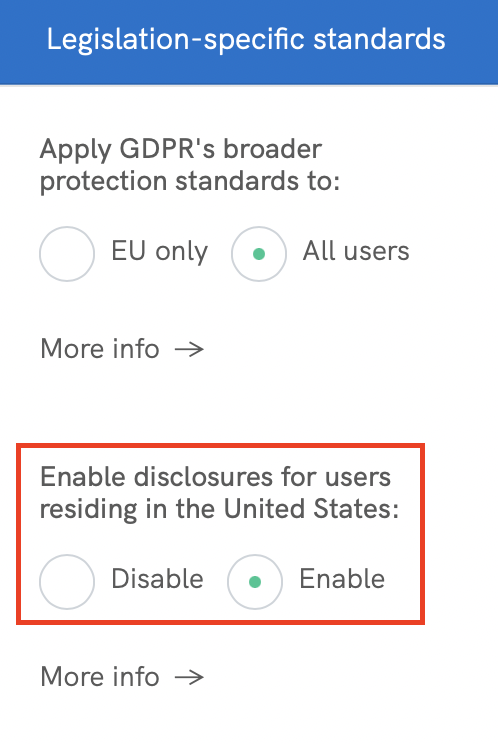 By enabling these disclosures, you are indicating your intent to comply with the privacy standards defined by US State laws. This feature helps ensure that the generated privacy policy aligns with the specific requirements and rights afforded to users in the respective state.