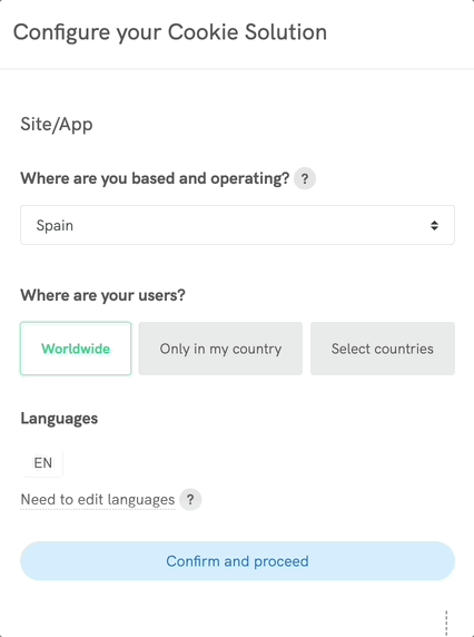 Firstly, you will be prompted to choose where you are based and where your users are based to set the territorial range of your site/app.