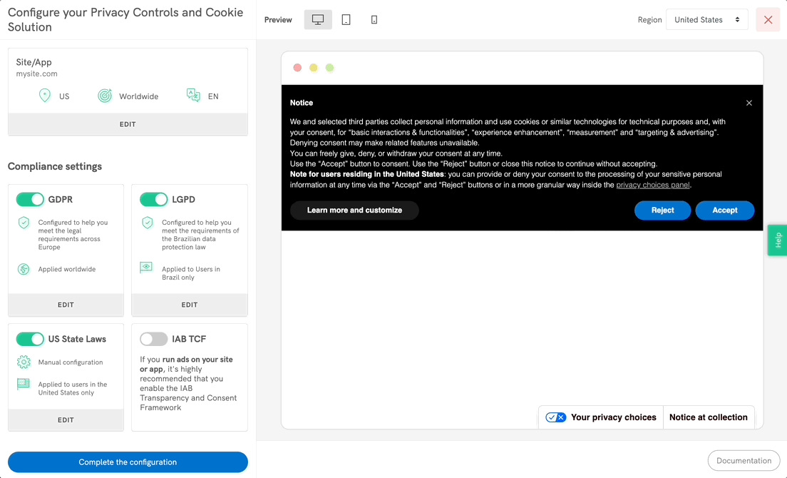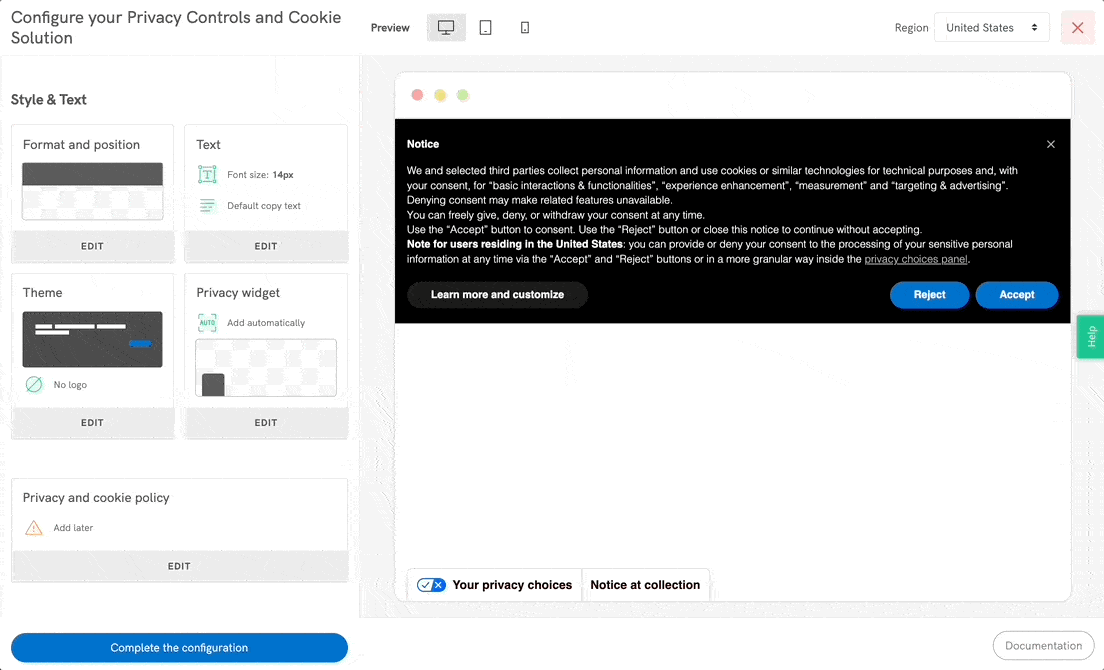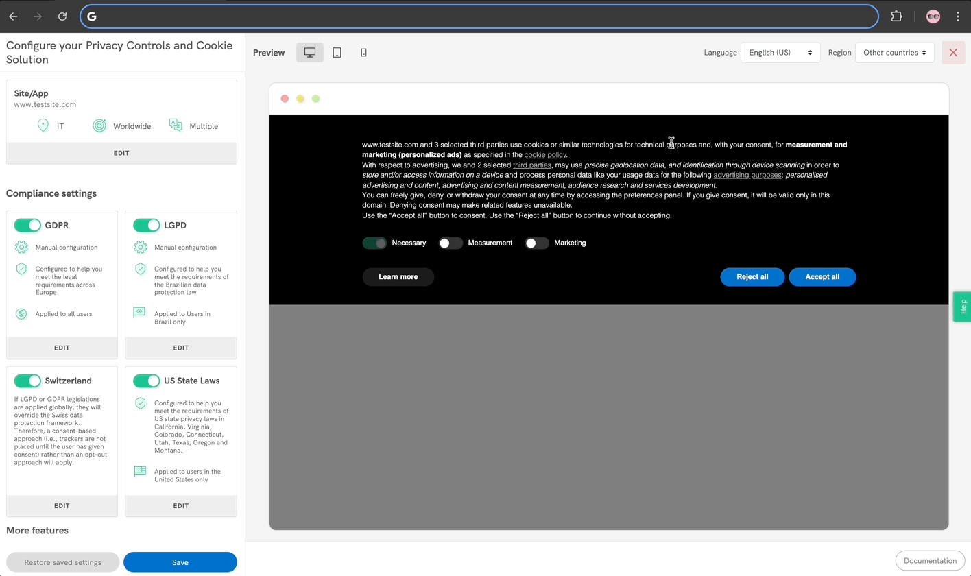💡 Any changes you make will be instantly shown in the preview area on the right side of the page. You can also switch to different views (desktop, tablet, mobile), display the banner in other languages (if you have them enabled) or preview the differentiated per-country copy (if some compliance setting is applied only to a subset of users).
