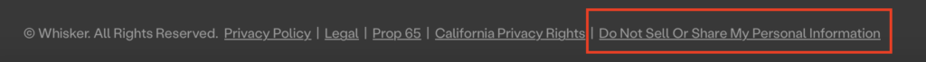 Here is an example of our Do Not Sell My Personal Information linked at the footer of Litter.robot.com. It is a simple link that redirects users to the request.