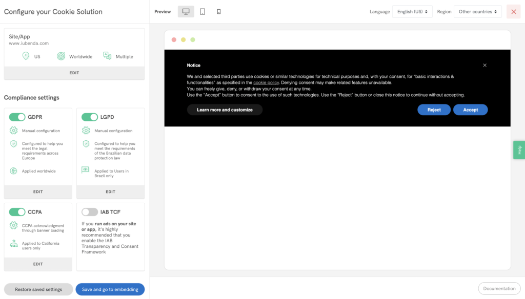 iubenda helps you create a customizable cookie banner, that automatically adapts its behavior to the location of your users. So if your users are based in the EU, it will apply an opt-in approach, while if they’re based in the US an opt-out one.