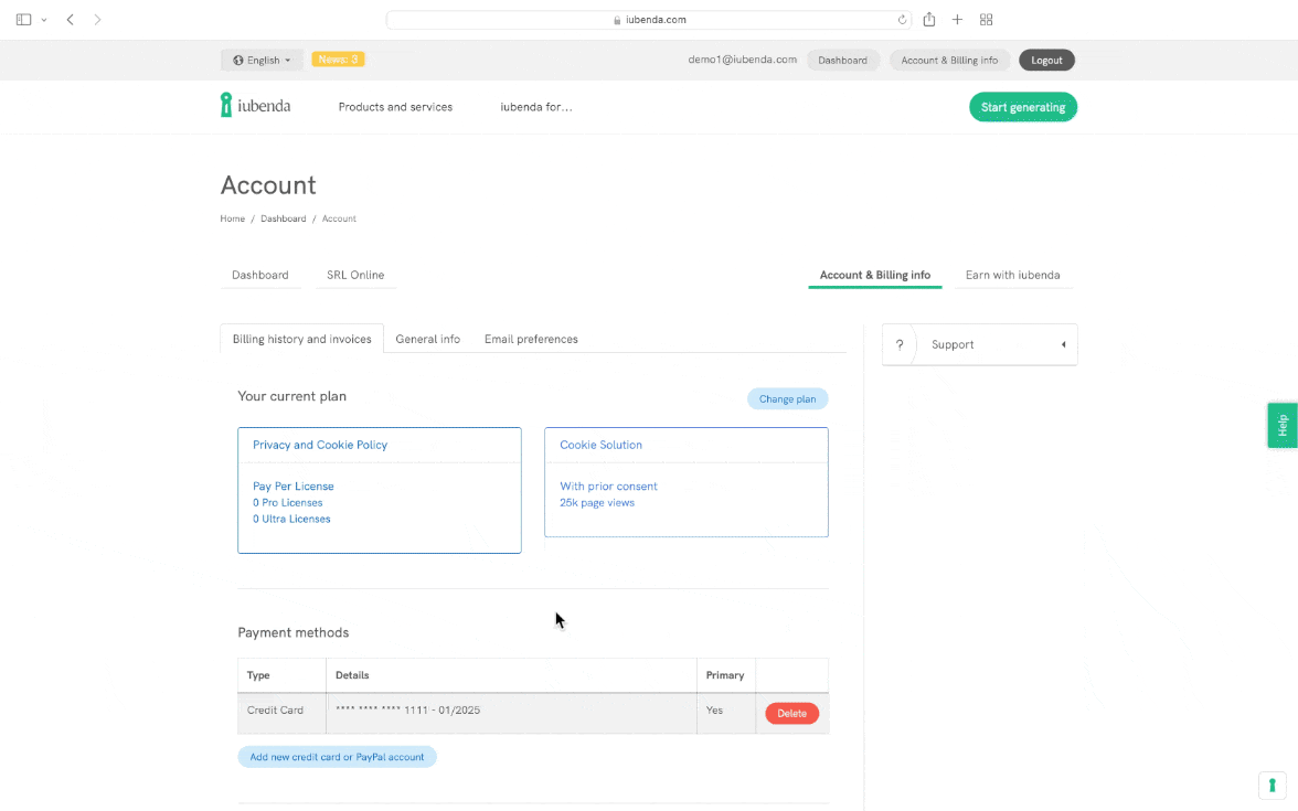 - Then, click on the “Account & Billing info” button in the drop down menu (top right-hand side of the page) to access your iubenda account page.