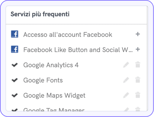 Ricevi consigli proattivi sulle clausole da includere in base ai servizi di terze parti che utilizzi, da Google Analytics a Facebook Remarketing.
