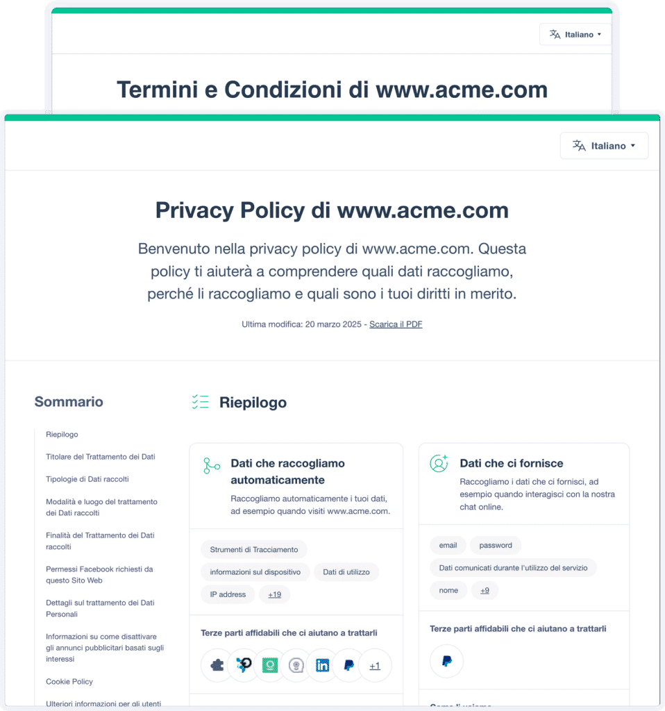 Genera e gestisci facilmente Termini e Condizioni professionali. Ottimizzato per e-commerce, marketplace, Saas, app e altro ancora.