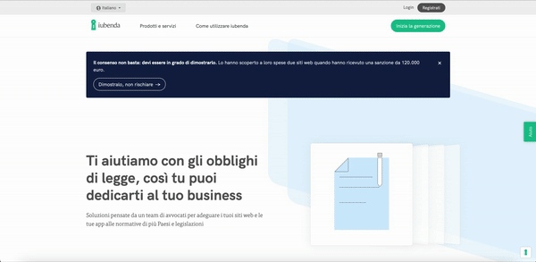 Privacy Controls and Cookie Solution di iubenda ti permette di creare il tuo cookie banner personalizzato in pochi click. La configurazione automatica applica in modo predefinito la normativa più stringente, per evitare di esporti a rischi di non conformità.