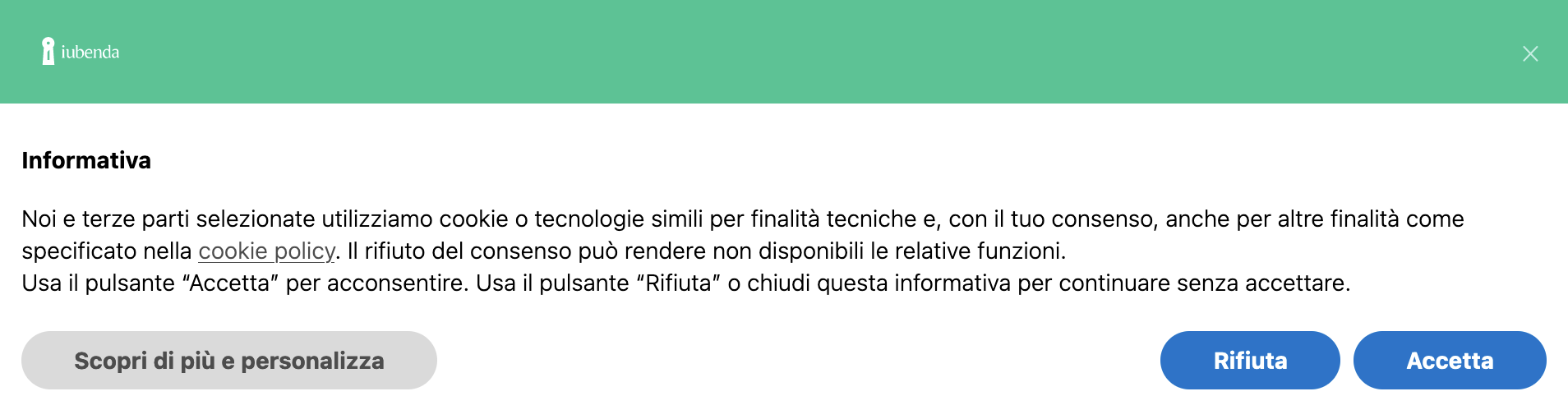 Nota bene: sebbene il cookie banner non sia obbligatorio in questi casi, devi comunque predisporre una cookie policy che informi gli utenti che stai usando cookie e tecnologie simili. Qui trovi un esempio di cookie policy da cui prendere spunto.