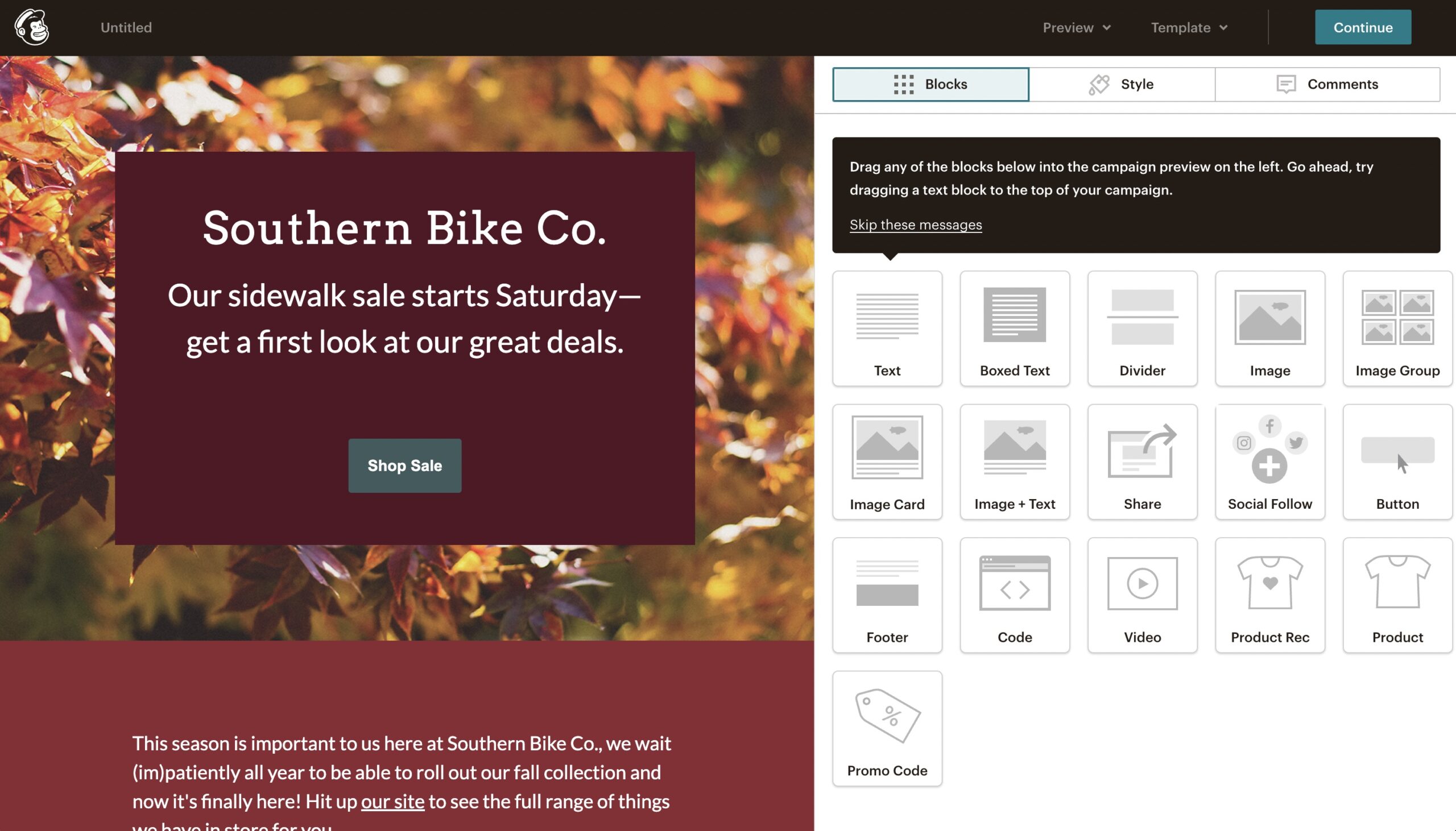 Successivamente, è necessario creare una campagna. Mailchimp offre diversi tipi di campagne, tra cui newsletter, promozioni e annunci. Ai fini di questo tutorial su come creare una newsletter in Mailchimp, ci concentreremo sulle newsletter. Dovrete scegliere un modello per la vostra newsletter e personalizzarlo per adattarlo al vostro marchio.